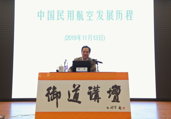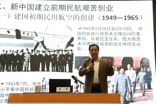 两场报告,李军以时间为轴线,从“旧中国航空艰难起步”、“新中国建立前期民航艰苦创业”、“改革开放以来民航持续快速发展”三个阶段对中国民航的改革和发展历程进行了深入浅出地讲解。