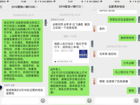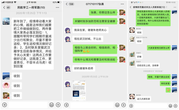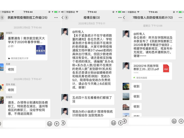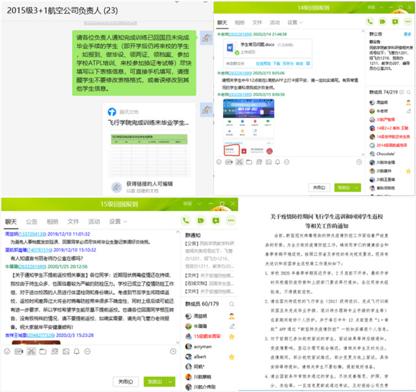 一方面,及时向送训学生和回国学生传达疫情期间学校的相关安排,详细就航校面试、送训、回国学生报到、ATPL课程培训、换证考试及毕业派遣等工作安排做了通报。为应对疫情,与公司和航校沟通,及时对航校面试、培训和送训等工作做了调整。协调公司和航校,妥善解决完成飞行训练学生的回国事宜。另一方面,密切关注回国学生的健康动态,将回国学生纳入i.南航APP每日打卡,并向学校申请该批学生返校后集中住宿管理,为春季开学返校提前做好预案。