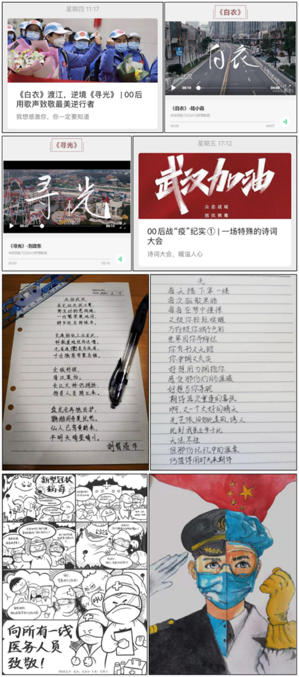 为了引导学生“宅着也能有意义,宅着也能做贡献”,按照团中央、团省委关于疫情防控工作的有关要求,学院开展“八个一”团内主题教育活动,引导学生在寒假期间积极抗击疫情,主动修学储能,展现青春担当。学生们创作了《寻光》、《白衣》两首战“疫”歌曲,向奋战在一线的工作人员致敬;发起了“特殊的诗词大会”,创作诗歌、散文等作品,用文字凝聚共同战“疫”的决心;通过电子海报、H5推送方式在网上传递抗击疫情正能量。