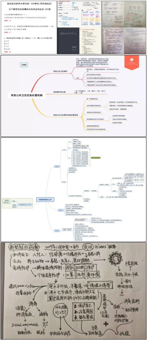 为了引导学生科学防控疫情,学生工作团队共同编写《新型冠状病毒肺炎知识应知应会100题》发放给学生学习,学生们在积极开展自学的同时,还通过学习笔记、思维导图、手抄报、PPT等方式面向身边的家人和亲朋好友进行科普宣传,展现青春担当。