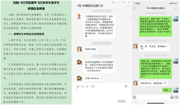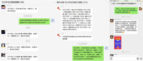 由于学生培养的特殊性,除交换生外,民航/飞行学院飞行技术专业学生及机场运行与管理(中澳合作办学)学生均需在本科阶段赴境外学习。因此,在境外疫情爆发之初,学院就迅速出击,指派专人负责,准确摸排,抓实抓细境外学生疫情防控基本数据,确保防控工作数据准确可靠,在疫情蔓延之后,学院党政联席会明确由两位副书记分别负责境外飞行学员和中澳合作办学的境外学生防控工作,强化防控工作落细落实。