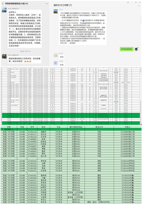 除了每日打卡外,学院还第一时间按照学生类别、送训批次、航校和所属航空公司等将学生精准分类,并指定学生负责人,将摸排工作责任到人,同时学院坚持“键对键”与“面对面”相结合,通过电话、微信、QQ等方式,每天点对点联系学生,全面系统的掌握和分析境外学生的健康情况,预警预判各类风险点,建立更新境外学生台账,为有效开展疫情防控工作提供了可靠支持。