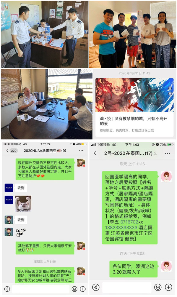 面向目前仍在境外的学生,学院充分利用微信群、微信公众号等渠道,第一时间向境外学生发布疫情变化动态和疫情防控信息通知,准确及时传达相关防控举措,倡导学生加强体育锻炼,在线谈心交流,加强正面引导,做好教育和引导工作。同时,学院积极与境外航校联系,联合保障学生防疫物资的供给。学院的及时宣传教育和远程支持保障,有效疏导了境外学生的恐慌情绪。