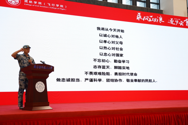 宣誓结束后,徐福民书记为全体2020级新生送上了寄语,他表示,希望新生们坚持学习和践行“忠诚担当的政治品格、严谨科学的专业精神、团结协作的工作作风、敬业奉献的职业操守”的当代民航精神,在奋斗中释放青春激情,在实践中追逐青春理想,以青春之我、奋斗之我,为民族复兴铺路架桥,为祖国建设添砖加瓦,在中国梦的生动实践中实现人生价值。