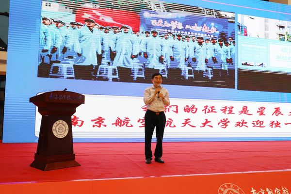 教务处处长孔垂谦、天目湖校区党工委书记张新明、天目湖校区管委会副主任缪长宗、午夜巴黎 (飞行学院)党委副书记贡海俊、校区军训旅教官与近千名新生共同听取了讲座。