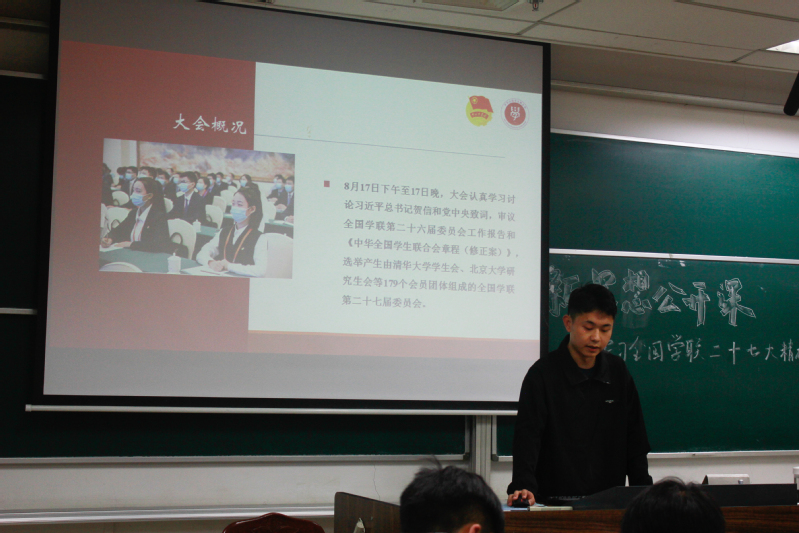 首先由黄邹洵进行了有关此次大会精神的专题报告与总结,指出本次活动意在高举习近平新时代中国特色社会主义思想的伟大旗帜,全面贯彻习近平总书记关于青年工作的重要思想和关于教育的重要论述,同时呼吁在座各位南航学子牢记习近平总书记的谆谆教诲,拼搏在新时代,奋斗在新时代,成长在新时代。