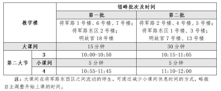 将军路校区、明故宫校区上午第3、4节课的上课时间调整为两批错峰:第一批大课间休息15分钟,第二批大课间休息30分钟;小课间均休息5分钟。具体教学楼错峰上下课的时间安排见下表: