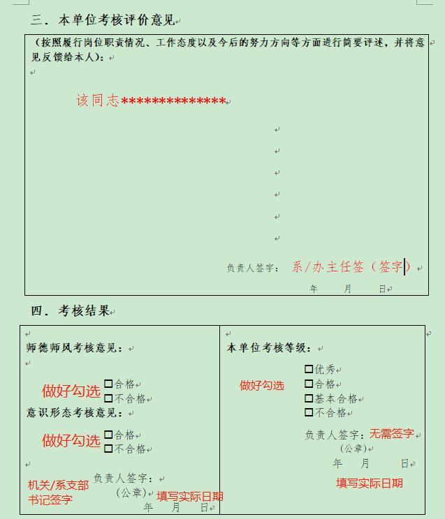 12月23日前 | 收取审核考核表,组织教职工考核述职,进行民主测评。系、办负责人填写考核评价意见后,将教职工个人考核表纸质版、考核结果汇总表(见附件2)电子版交至学院党政办张梦璇老师处[email protected]。 1.业务考核:各系、办完成业务考核,并在本单位考核评价意见处填写评价意见,系、办主任签字。 2. 师风师德、意识形态考核:各党支部书记完成本支部教师的师风师德、意识形态考核,并在考核评价意见处填写评价意见:师风师德考核合格/不合格,意识形态考核合格/不合格。 3.院聘劳务派遣人员请填写《午夜巴黎 管理岗位年度考核表》(见附件3)。 4.填写要求参照附件1,日期按照实际考核日期填写即可。 | 各系、办 |